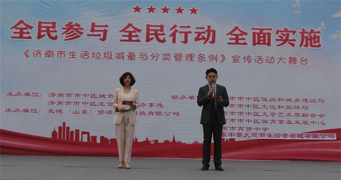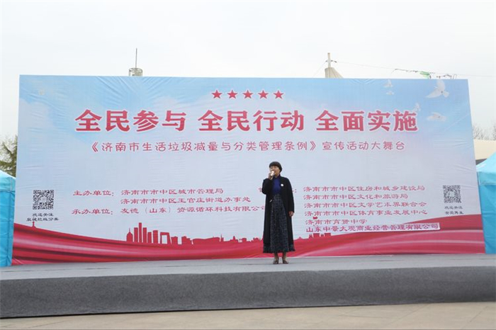春到泉城,百花齊放,萬象更新。 3月19日下午,濟南王官莊社區(qū)大眾廣場樂聲悠揚、舞姿翩翩、笑聲連連,由濟南市市中區(qū)城管局、王官莊街道辦事處主辦,友德(山東)資源循環(huán)科技有限公司承辦的“全民參與 全民行動 全面實施 《濟南市生活垃圾減量與分類管理條例》宣傳活動大舞臺”盛大開啟。市中區(qū)副區(qū)長殷繼明、市中區(qū)城管局副局長林學彬、王官莊街道黨工委書記張敬軒、王官莊街道辦事處主任冉秀玲以及市中區(qū)住房和城鄉(xiāng)建設局、市中區(qū)文旅局、市中區(qū)文學藝術界聯(lián)合會、市中區(qū)體育事業(yè)發(fā)展中心、濟南市育賢中學、山東中景大觀商業(yè)經(jīng)營管理有限公司等單位領導出席;友德資源董事會單計磊、董建華出席活動現(xiàn)場。