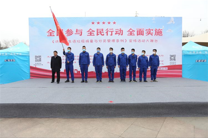 市中區(qū)副區(qū)長殷繼明為城管、網(wǎng)格員、友德資源組成的垃圾分類督導隊授旗。