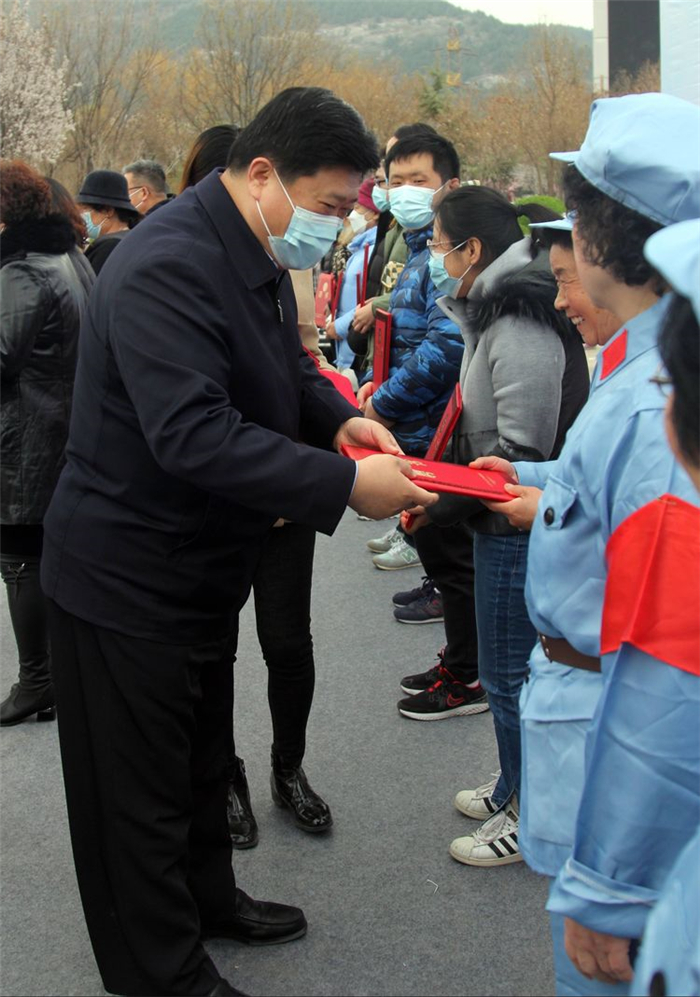王官莊街道黨工委書記張敬軒等領導為垃圾分類輔導員頒發(fā)聘書。